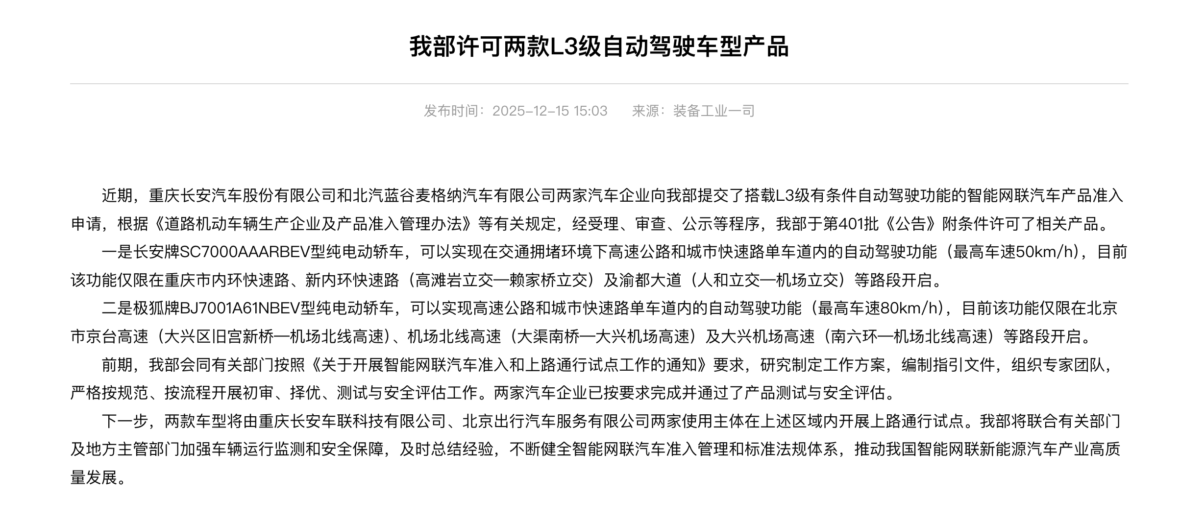 凤凰网科技讯 12月15日,工业和信息化部公布了两款L3级自动驾驶车型产品。分别是长安牌SC7000AAARBEV型纯电动轿车,二是极狐牌BJ7001A61NBEV型纯电动轿车。查询得知,上述两款车型分别对应长安深蓝SL03和极狐阿尔法S6。