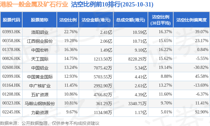 - 510月31日港股一般金属及矿石行业沽空数据盘点,洛阳钼业、江西铜业股份、赣锋锂业沽空金额位居行业前三