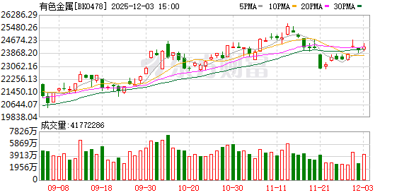 银河证券表示,在纽约联储主席鸽派言论及疲软非农数据影响下,市场对12月降息的预期概率已超80%,流动性边际宽松或持续支撑黄金、白银价格上涨。东方证券指出,在中期供需格局趋紧与通胀预期上行的背景下,金铜的跨年行情或从12月展开,有色金属板块布局正当时。
