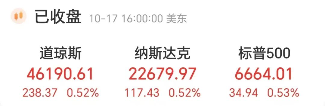 当地时间周五(10月17日)美股三大指数收盘全线上涨。截至收盘,道琼斯工业平均指数比前一交易日上涨238.37点,收于46190.61点,涨幅为0.52%;...
